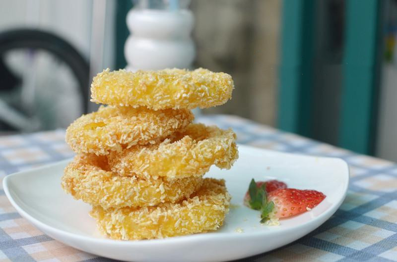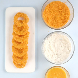 2. Beat the eggs, and wrap all the processed apple rings with a layer of flour, a layer of egg liquid and a layer of breadcrumbs in turn.