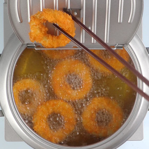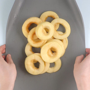 Put the apple rings in a hot oil pan, turn to medium-low heat and fry them until golden brown, then ready to be eaten.
