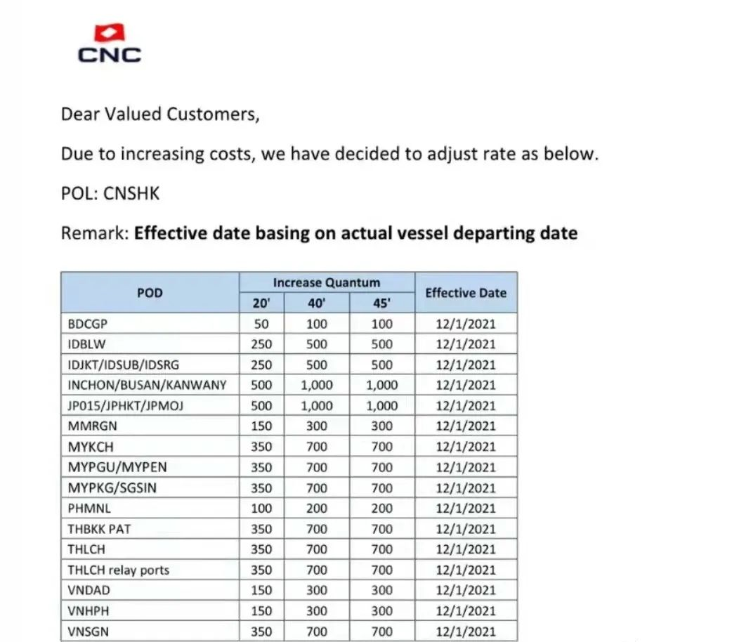 The following is the price increase notice just released by CNC, a subsidiary of CMA CGM that focuses on the Asian market, and the increase is not small!