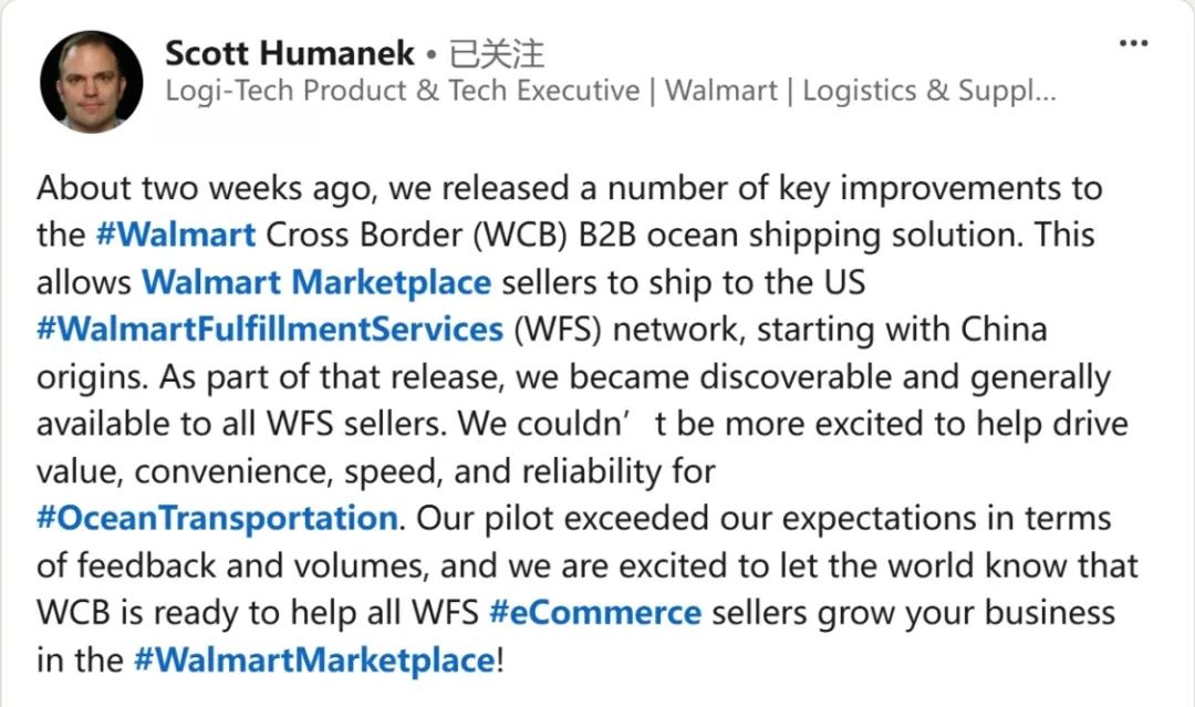 Recently, Scott Humanek, a Walmart official, revealed on social media: About two weeks ago, Walmart made some key improvements to the WCB B2B shipping solution, which allows sellers on the Walmart market to directly ship goods made in China to Walmart's US distribution center network through Walmart's cross-border shipping solution.