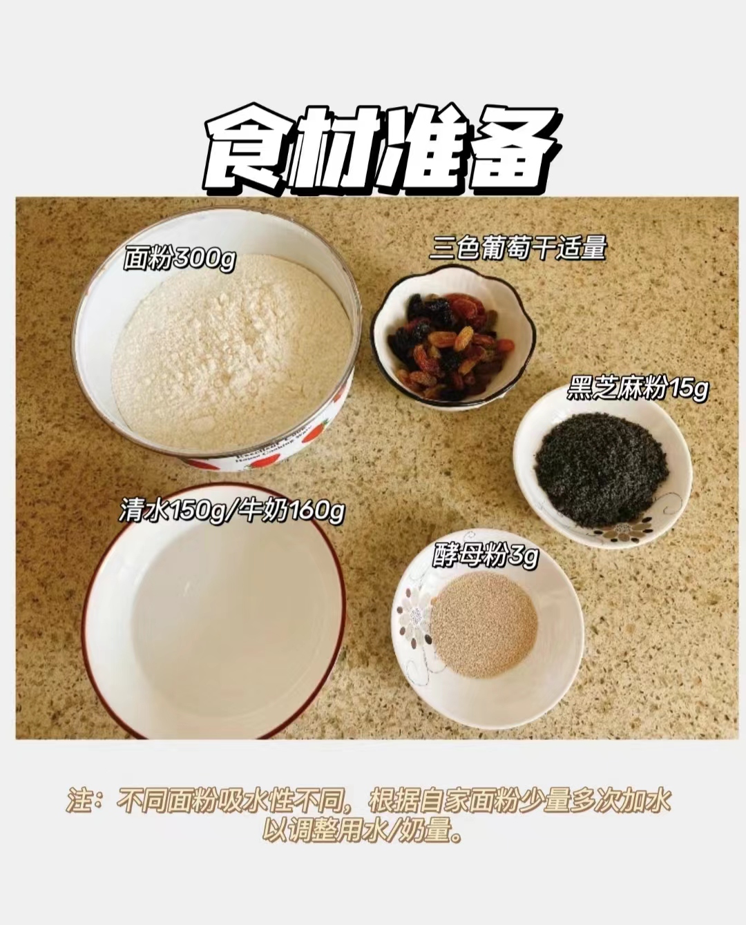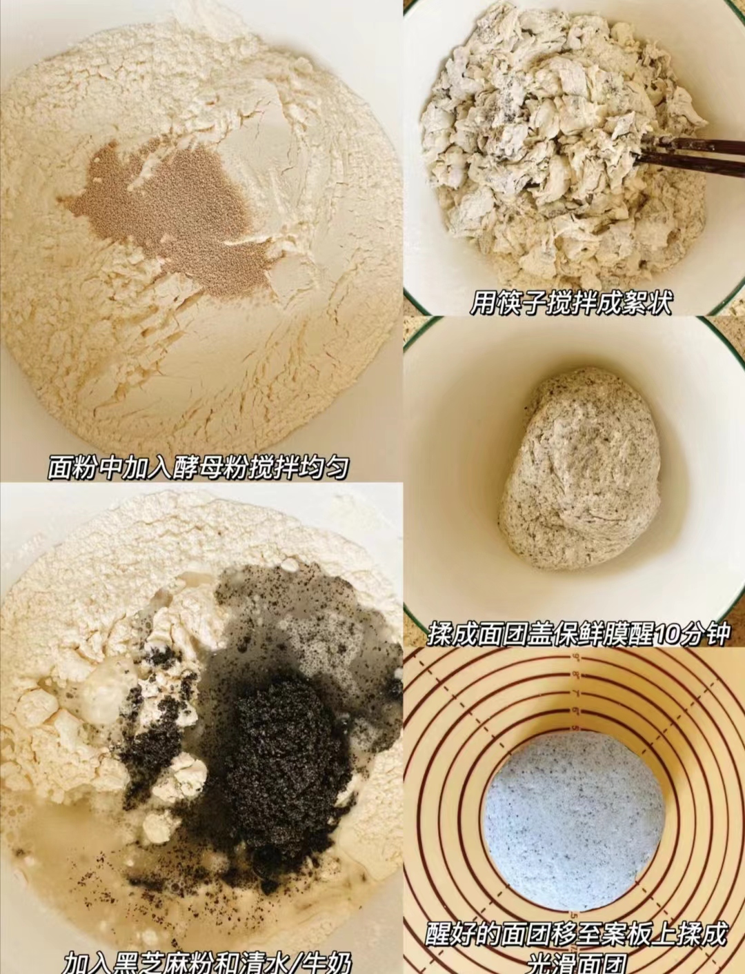 1.Adding yeast powder into the flour and mixing well, pouring in black sesame powder, water or milk and mix to form a floc, kneading the dough and covering with plastic wrap to let it rise for 10 minutes; transferring the dough to a board and kneading it to form a smooth dough.