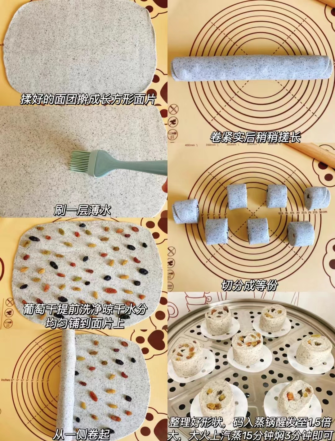 2.Using a rolling pin to roll into a rectangular sheet, brushing a thin layer of water, evenly spread the washed and dried raisins, rolling up from one side, rolling up tightly, rolling up, rolling up a little long, cutting into equal portions, sorting out the shape into the steamer, then let rise until 1.5 times the size of the steamer, steaming over high heat for 15 minutes to simmer for 3 minutes.