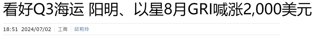 Earlier, Yang Ming also released a positive signal at the end of June. The third quarter entered the traditional peak season in Europe and the United States, and the shipping industry ships were fully operational, supporting the rise in freight rates. Industry insiders pointed out that Yang Ming also plans to adjust the peak season surcharge for direct customers again on July 15, which is expected to increase significantly from US$600 per large container to US$1,800-2,000 to keep in line with the strategy of the leading shipping companies.