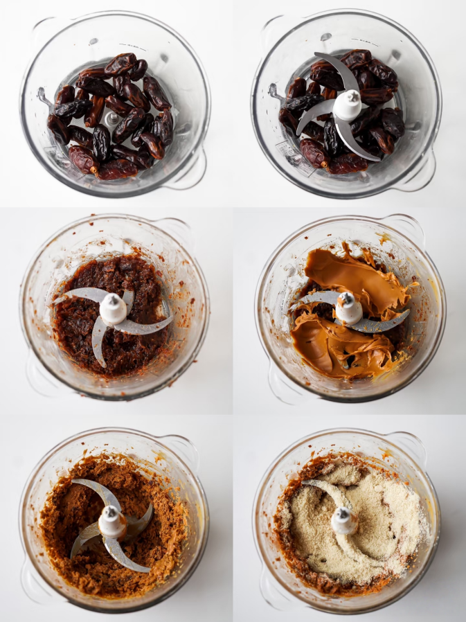 2. Add the peanut butter and almond flour. Continue blending until well combined, forming a thick, moldable dough.