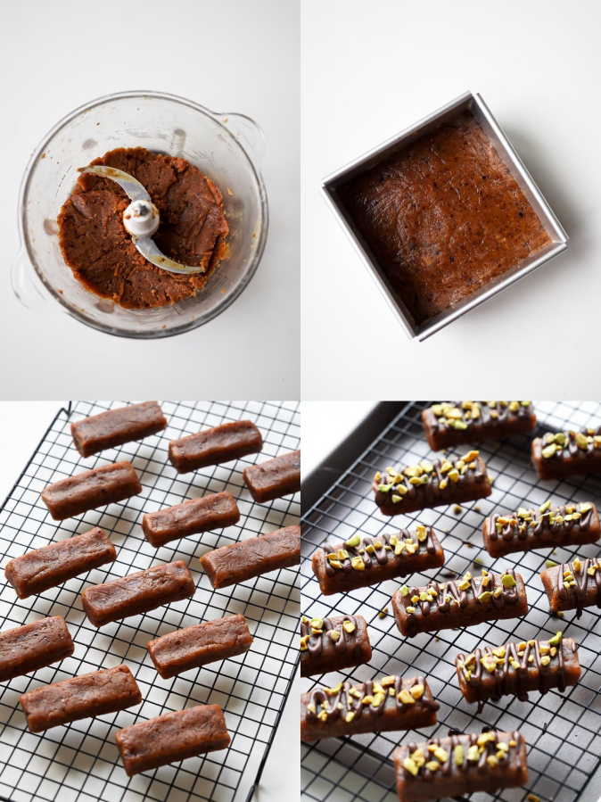 4. Melt dark chocolate (about 50g) over a double boiler. Drizzle over the energy bars and sprinkle with chopped pistachios for decoration.