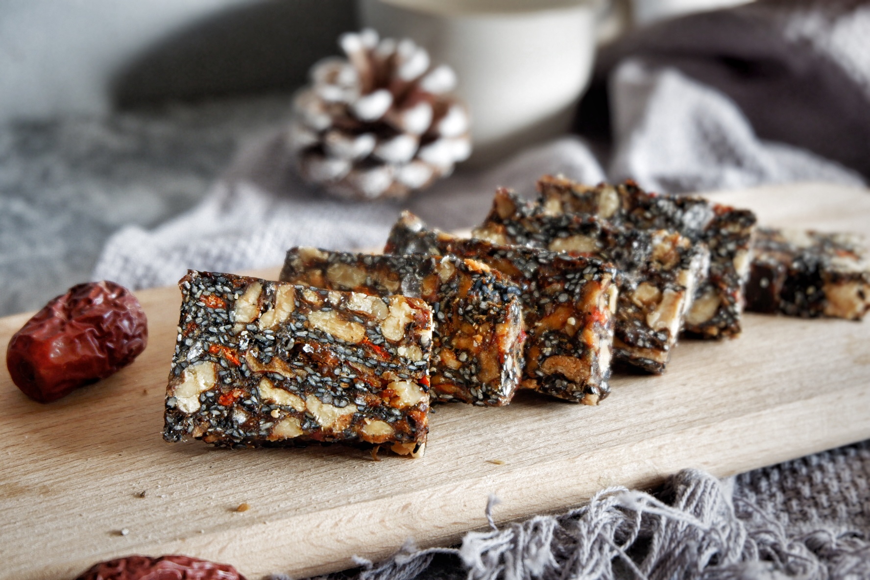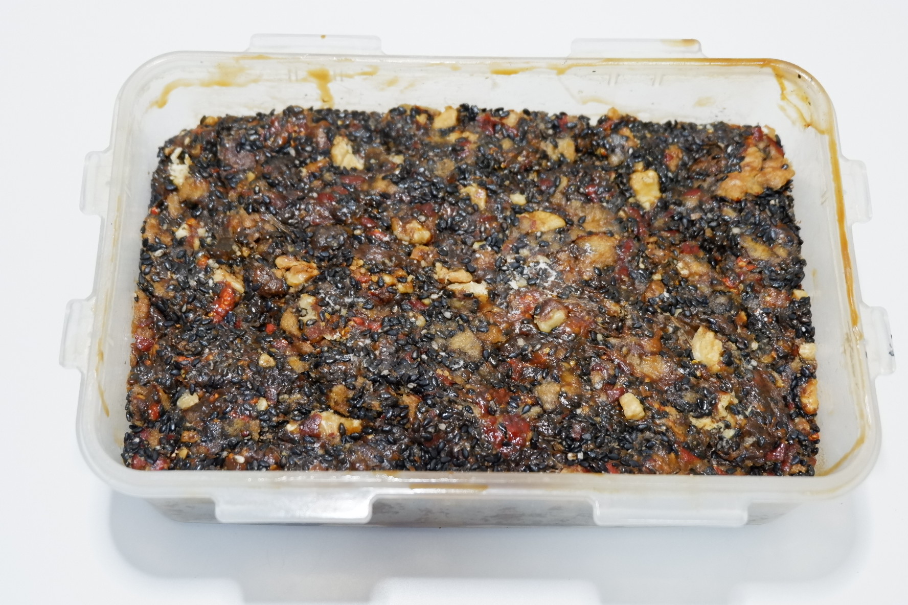 9.After adding Gojiberry, red jujube, walnut and black sesame in turn, stir all the ingredients well.