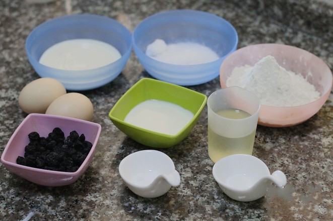 2 whole eggs, 100g fine granulated sugar, 120g salad oil, 70g milk, 160g plain yogurt, 200g low gluten flour, 2 tablespoons baking powder, 1 / 4 tablespoon dried Blueberry Yogurt, 100g dried blueberry.