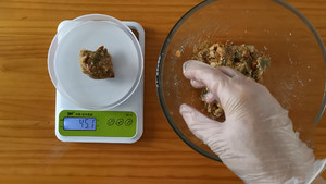 8.A 75g mold with a diameter of 6cm was used, and the ratio of skin to filling was 4:6. After the five nuts filling is left to rest, divide into ten 45g dosage pieces, knead and put into the baking tray for later use.