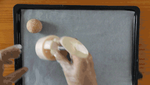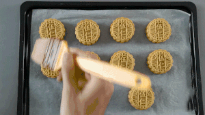 12.Put the cake in a baking tray and press the pattern with a mold until all the cakes are finished. Spray a layer of water mist on the surface of the moon cake and put it into the middle layer of the oven.