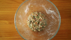 7.Then add cooked glutinous rice flour and continue to stir well. Form the five nuts filling into a ball, cover with plastic wrap and let stand for 30 minutes.