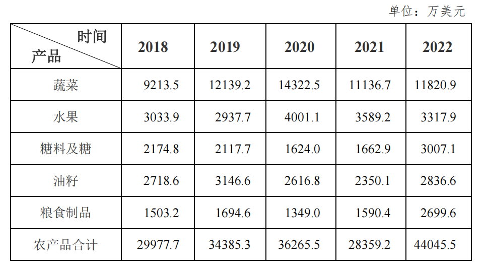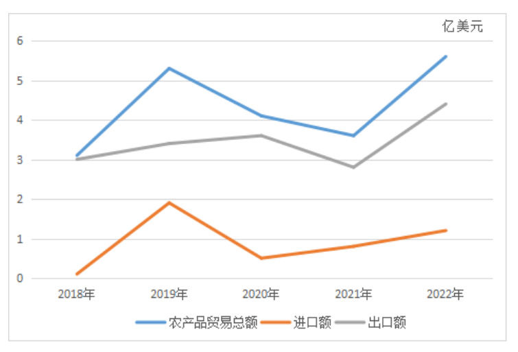 The trade volume of agricultural products between the two countries fluctuated and changed greatly in the past five years, from US $310 million in 2018 to US $560 million in 2022, with a decline in 2020 and 2021 and an increase in other years. Imports increased from US $10 million in 2018 to US $120 million in 2022, of which imports reached US $190 million in 2019, while exports increased from US $300 million in 2018 to US $440 million in 2022, maintaining growth except for a decline in 2021. (figure 1)