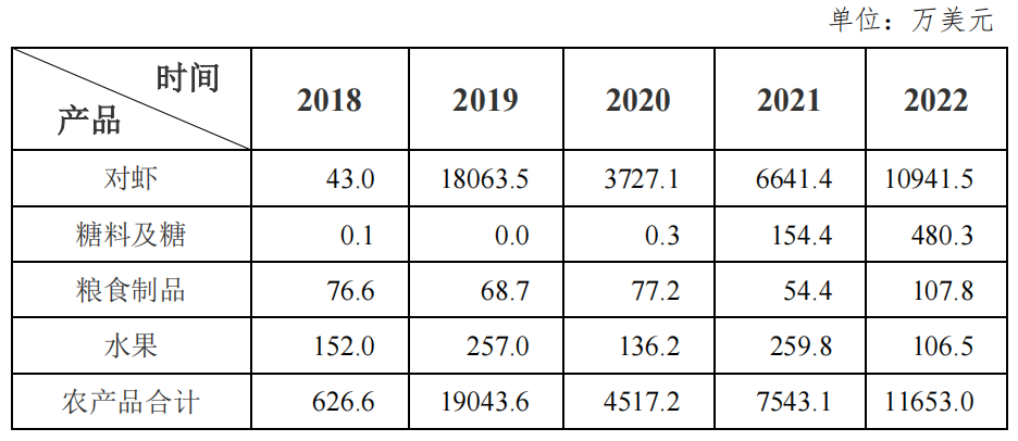 The second to fourth agricultural products imported in 2022 were sugar materials and sugar, grain products and fruits, accounting for only 4.1%, 0.9% and 0.9% respectively (Table 1).
