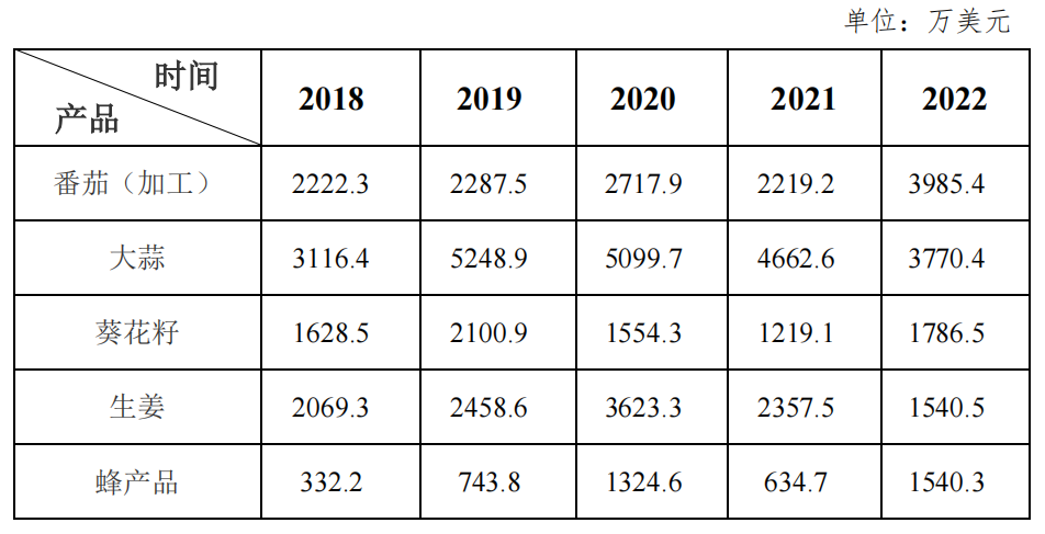 Among China's agricultural exports to Saudi Arabia in 2022, the top five agricultural products were tomato (processing), garlic, sunflower seeds, ginger and bee products, with exports of US $39.854 million, US $37.704 million, US $17.865 million, US $15.405 million and US $15.403 million, respectively. And the exports of various products have fluctuated significantly in the past five years (Table 3).