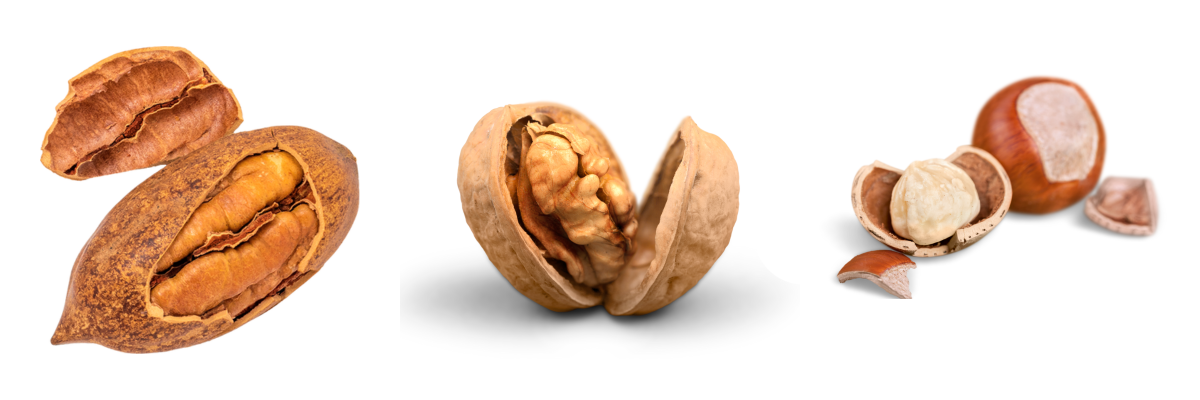 Technically a nut is a dry fruit that has a single seed, a hard shell, and a protective husk. So a hazelnut, pecan, walnut, and chestnut all grow like that.