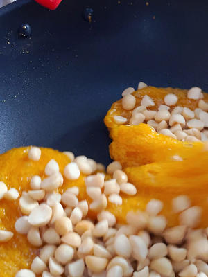 7. Turn off the heat when boil to 112-115 degrees. If you like a little soft you can turn off the heat when 112 degrees. If you like a little hard and chewy then you can boil to about 115 degrees then turn off the heat, and then add the macadamia nuts in, stir evenly ~