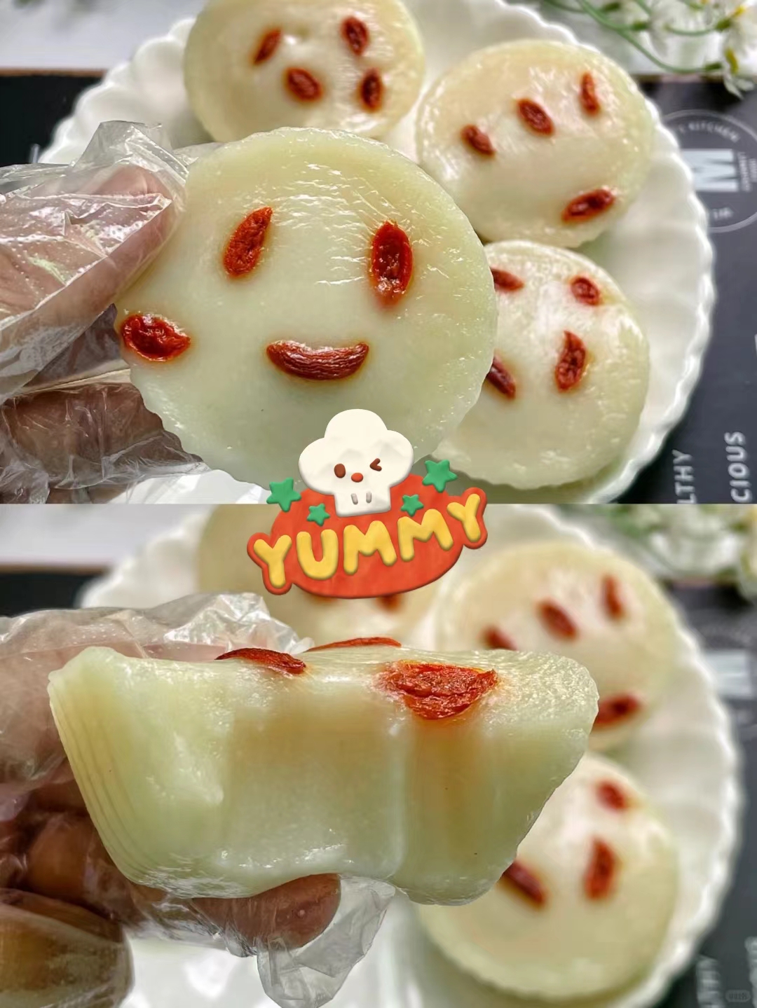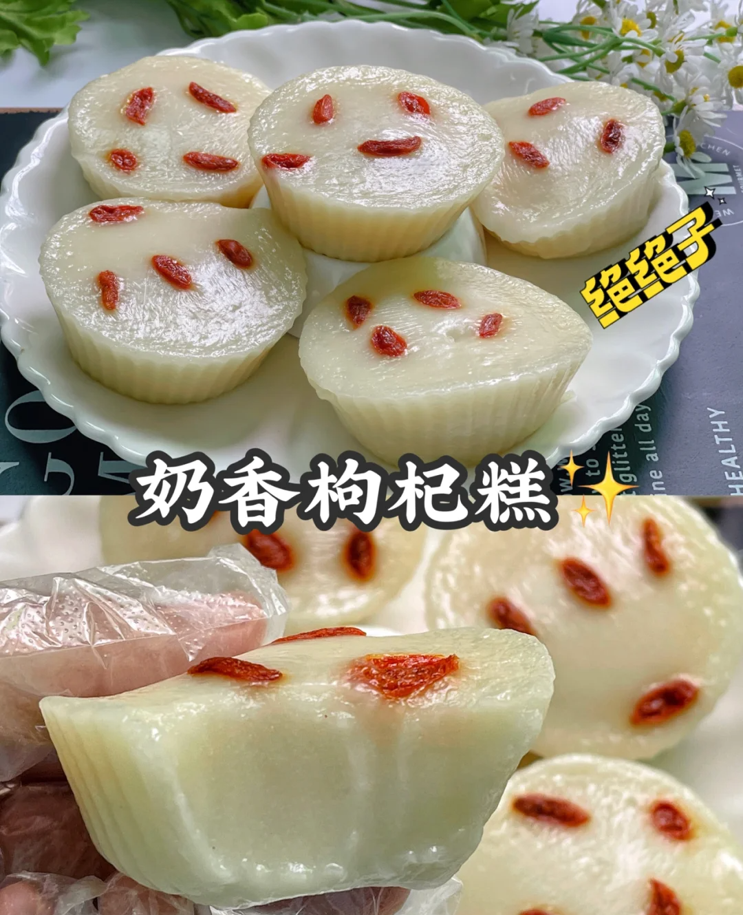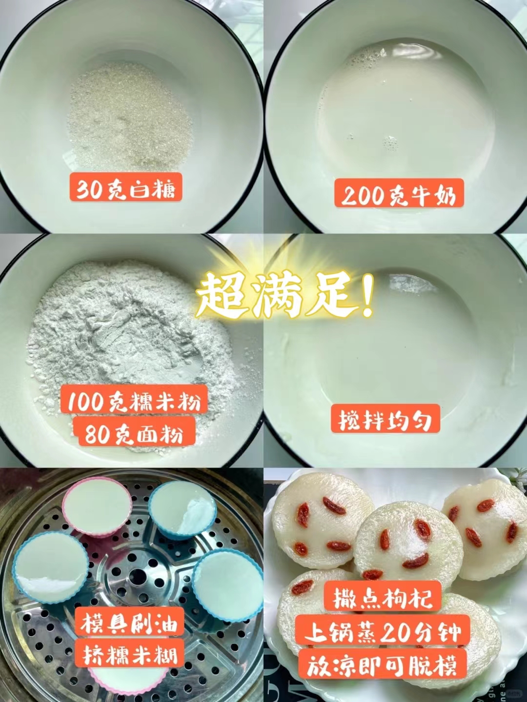 Brushing the mold with oil, boiling the water and squeezing the rice paste into the mold, sprinkling with goji berries and steaming for 20 minutes, let cool and can be removed from the mold!