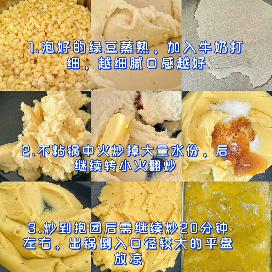 3. Heat corn oil in a non-stick pan. Add the mung bean paste and stir-fry over medium-low heat until the oil is fully absorbed. Add butter and continue stirring.