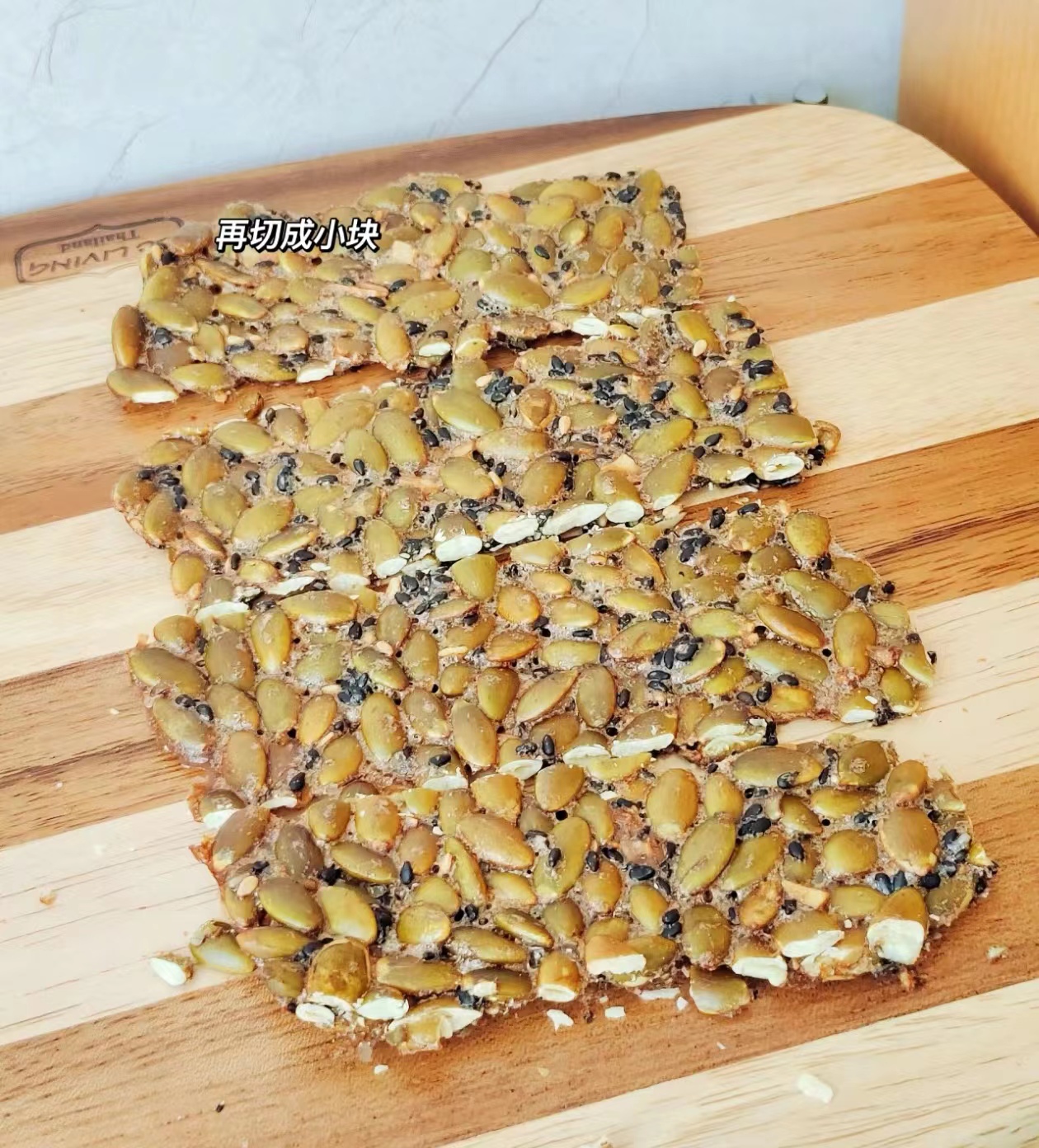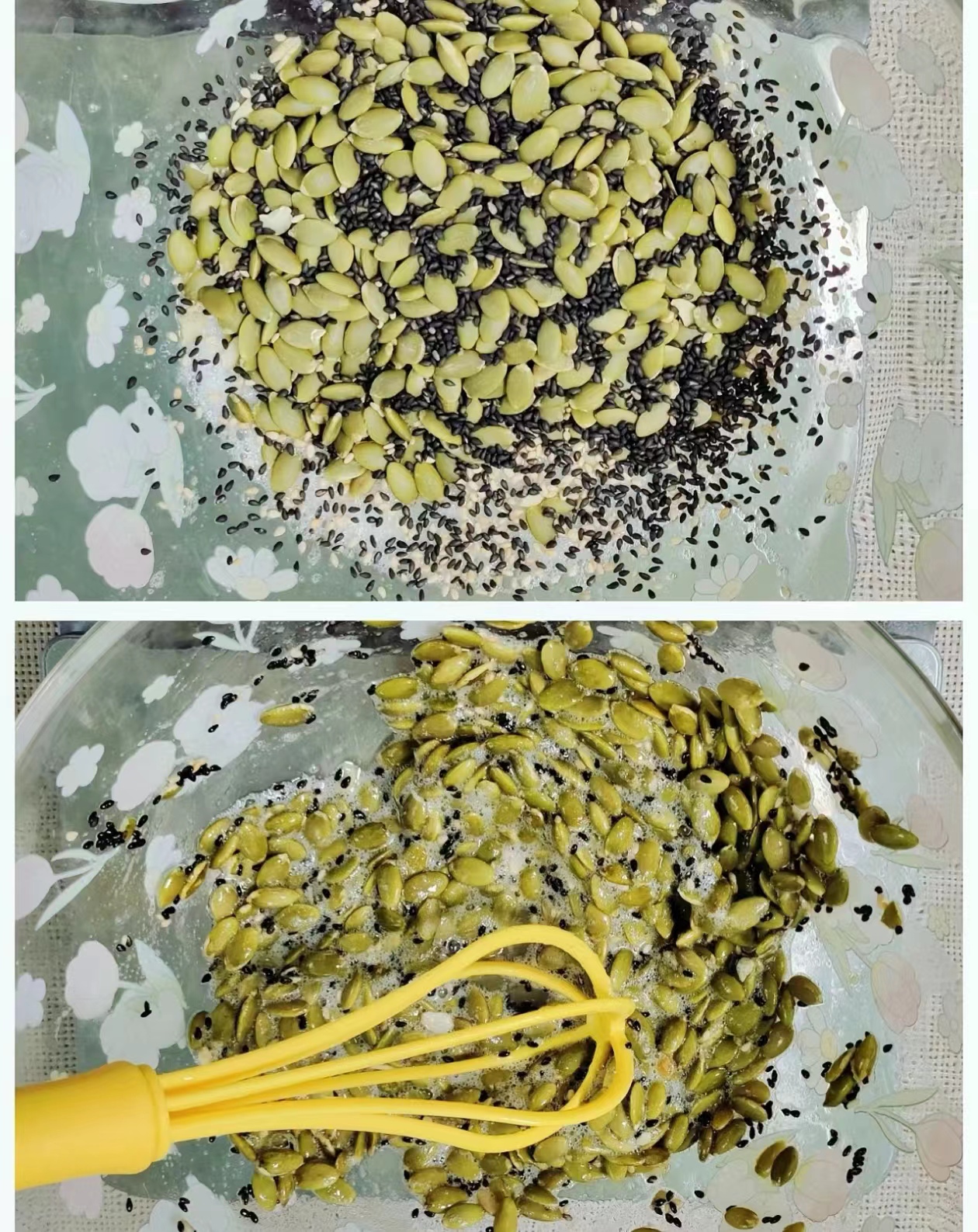 Adding 100g pumpkin seed kernels and 10g black sesame seeds and mixing well.