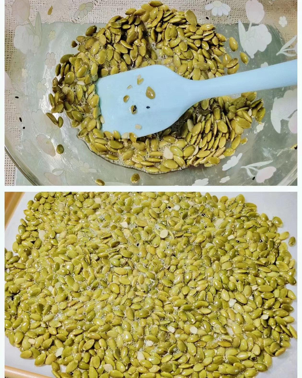 Then add 120g of pumpkin seed kernels and mix well.
