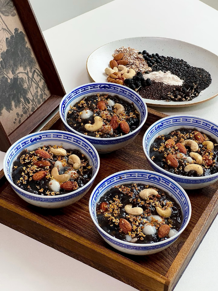 Ingredients: Black sesame, black beans, black goji berries, mulberries, black rice, black wheat, quinoa, chia seeds, lotus root powder, walnuts, cashews, almonds, macadamia nuts.