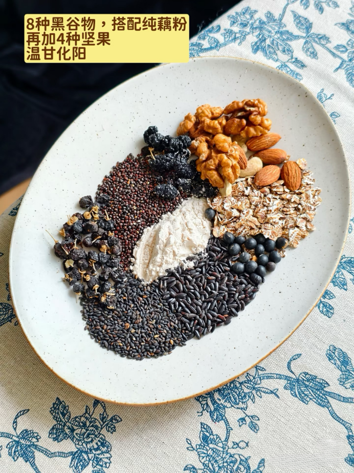 Intangible Cultural Heritage recipe: Nine-Black Nut Lotus Root Powder contains 8 kinds of black foods (honored as "grains for kidney essence"), 4 large nuts rich in Omega-3, with pure lotus root powder as the base—an alkaline food favored by the spleen and stomach.