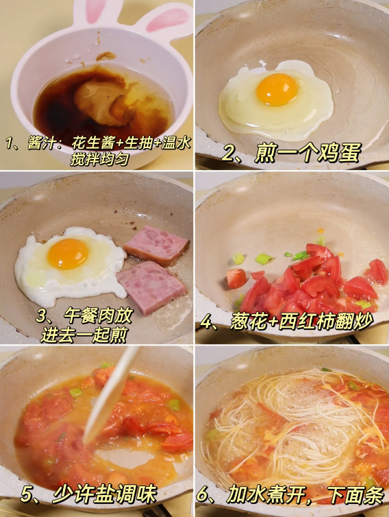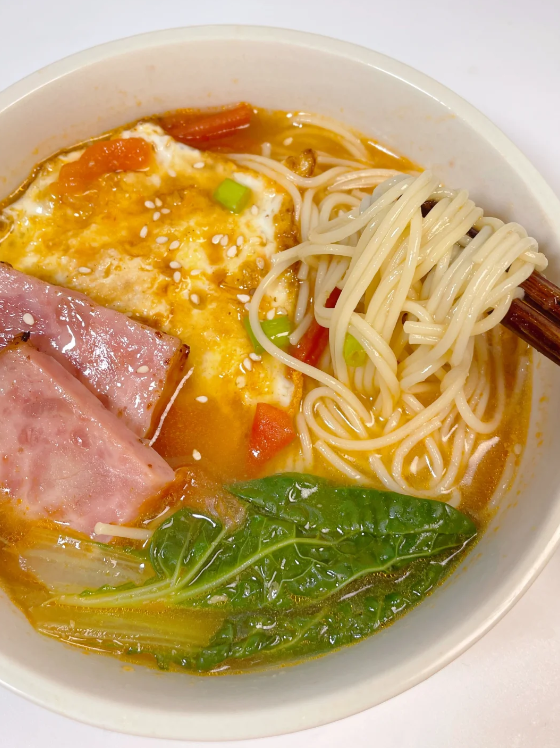 5.Finally, put the noodle soup in the sauce, put the noodles and vegetables, lunch meat, fried egg.