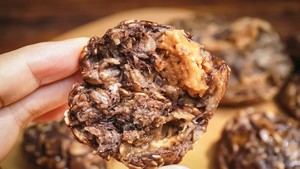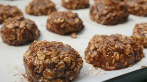 4.Scoop a scoop of about 5g of peanut butter on the oats, gently push the oat purée with two palms, and wrap the peanut butter in the middle of the oat purée