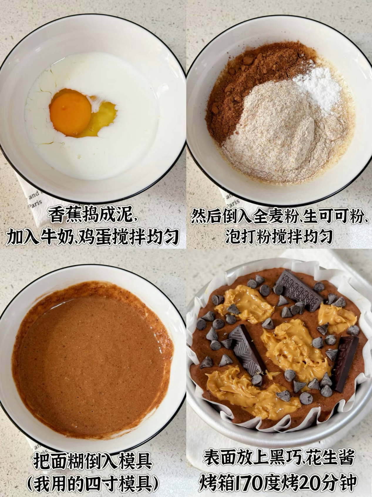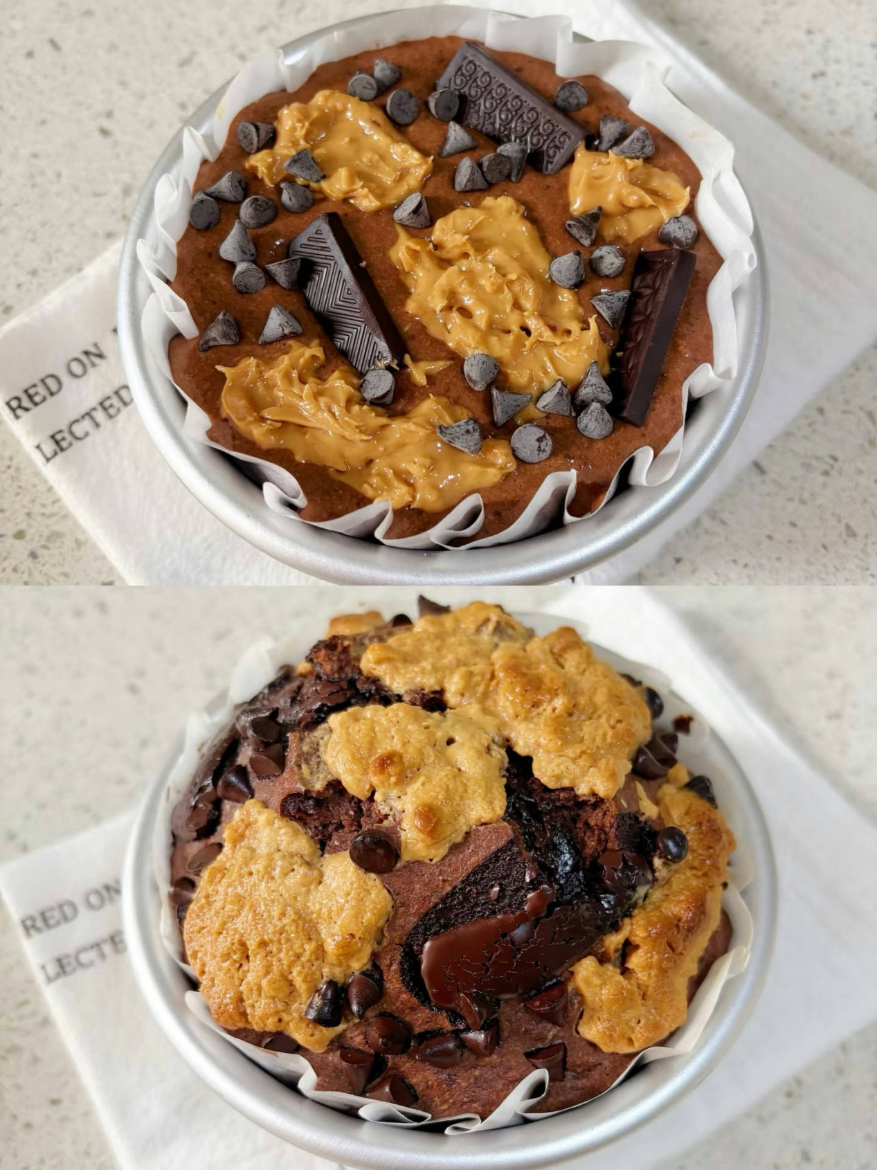3.Pour the batter into a mold (I used a 4-inch one). Top with dark chocolate chunks and peanut butter. Bake at 170°C (340°F) for 20 minutes.
