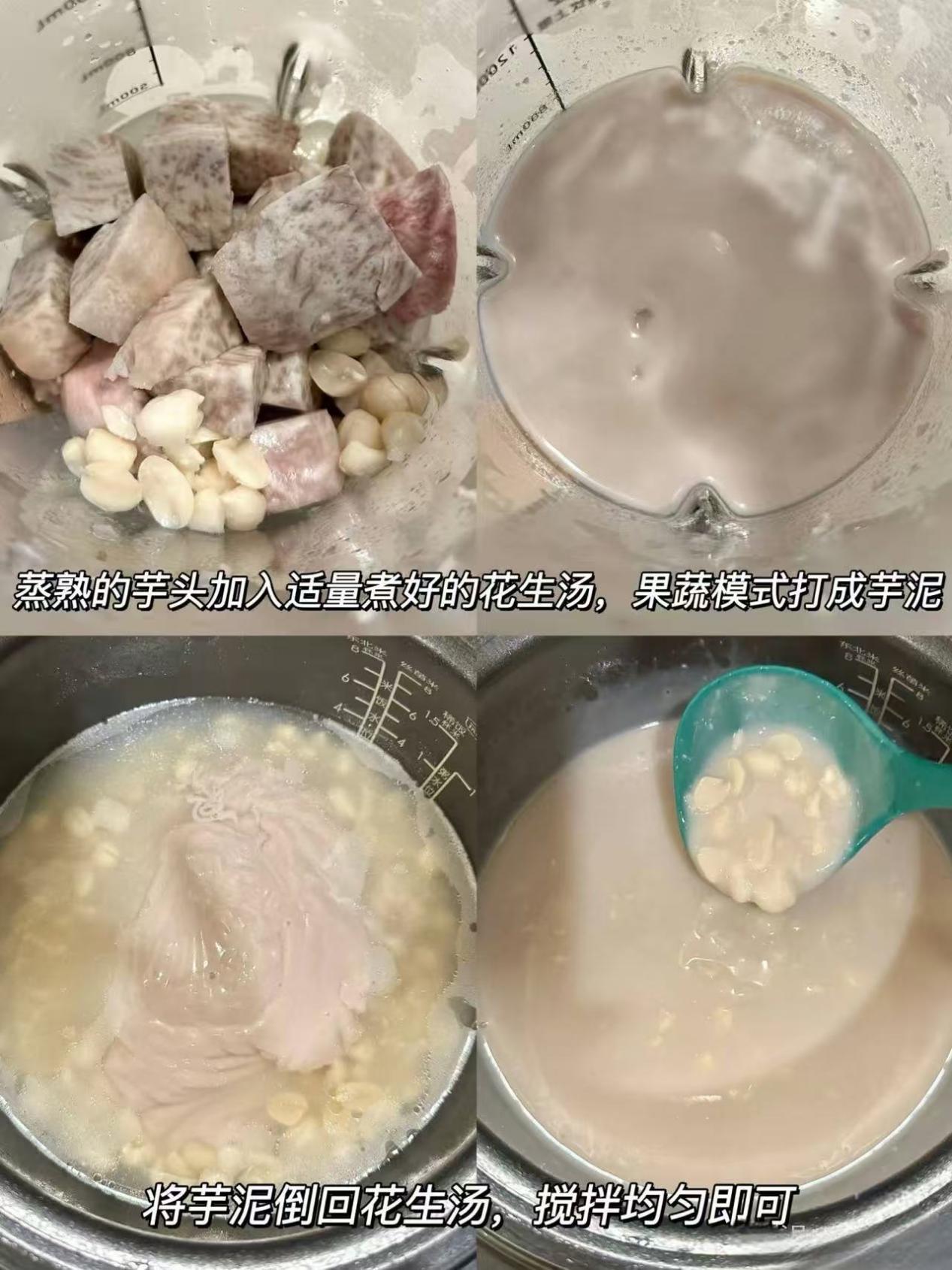 4.Blend the steamed taro with some of the cooked peanut soup using a blender until smooth.