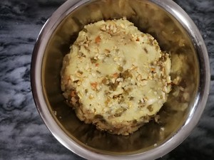 Step 10. Pour roasted chopped peanuts and raisins into the dough and knead evenly. Please don't knead the dough excessively to make the dough gluten.