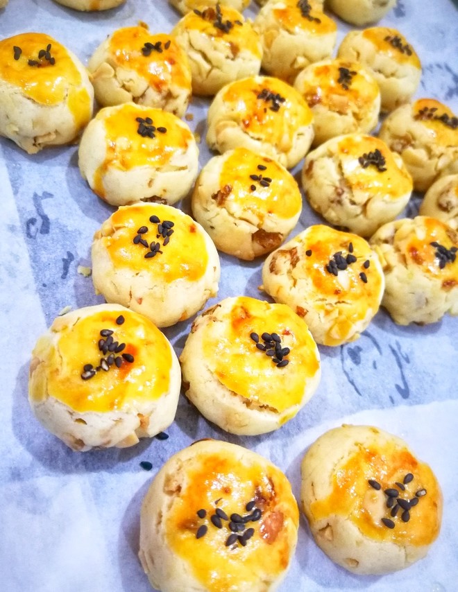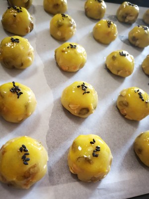 80 g roasted chopped peanuts, 60 g raisins, 40 g corn oil, 35 g lard, 65 g sugar, 2 pieces eggs, 185 g low-gluten flour, 3 g baking powder, 1.5 g salt, some of black sesame seeds