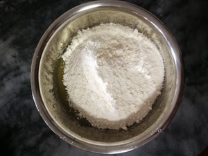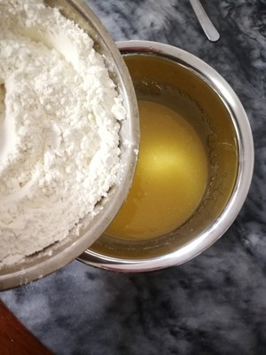 Step 8. Pour the powder into the emulsified egg liquid and pinch it with your hands. Don't over-pinch to make the dough gluten.