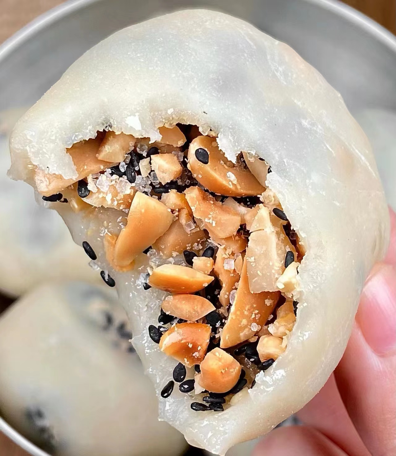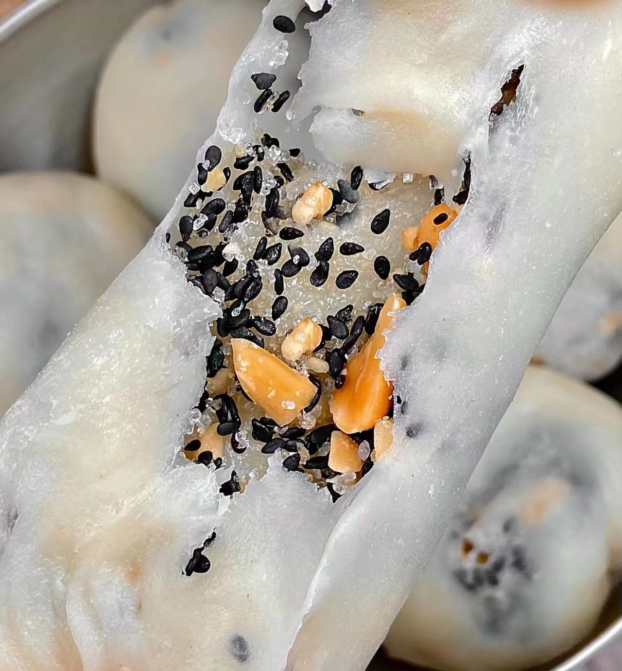 2.Filling: 100g of cracked peanuts with 15g of black sesame, 20g of sugar, then mix well.