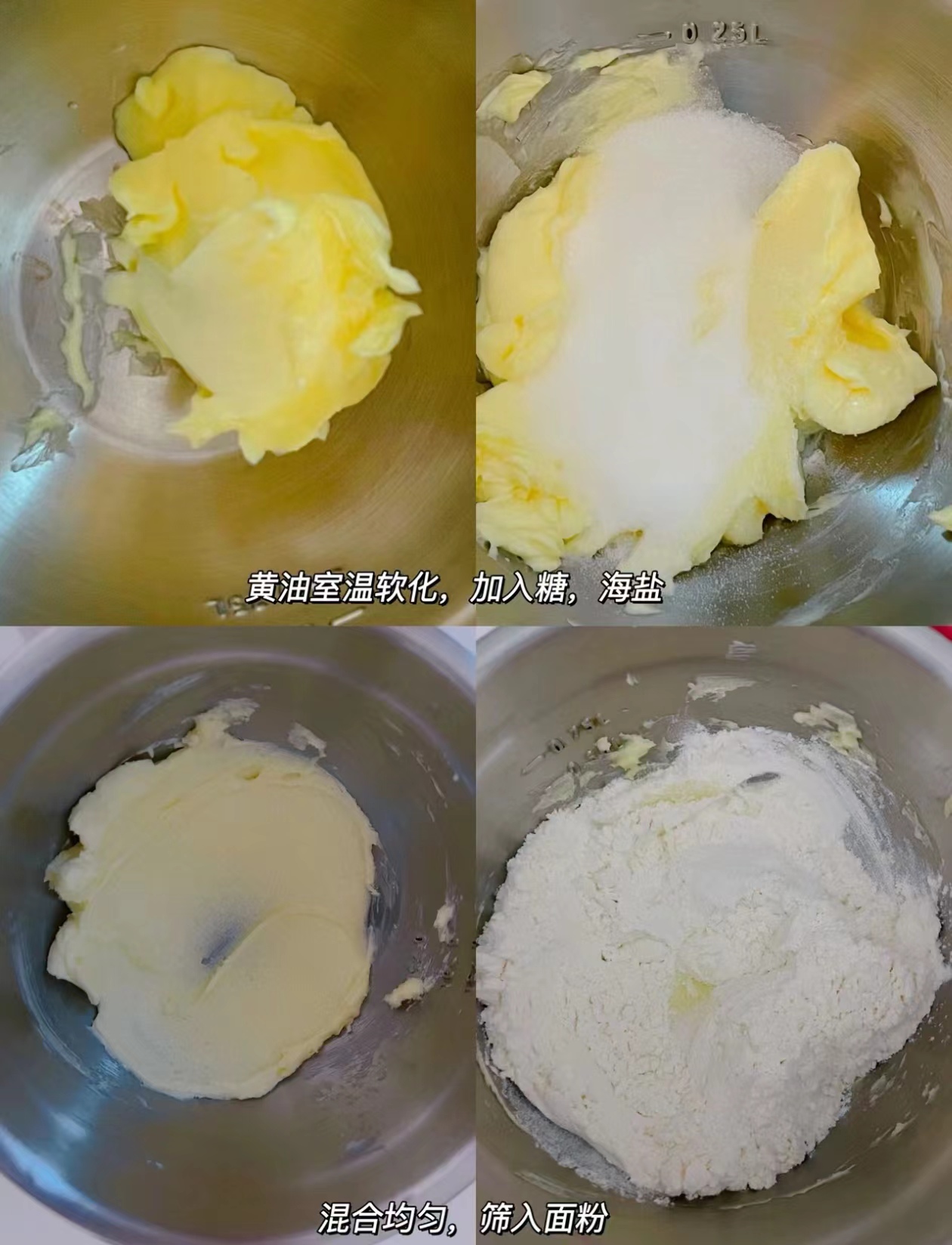 Soften the butter at room temperature, if it's cold you can put it in the oven with the fermentation function or fermentation box to soften it, adding sea salt, icing sugar, and mixing it until it's smooth.