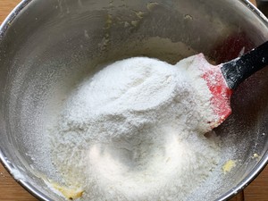 5. Add the mixture and sifted baking powder and beat with a spatula until no dry powder is present.