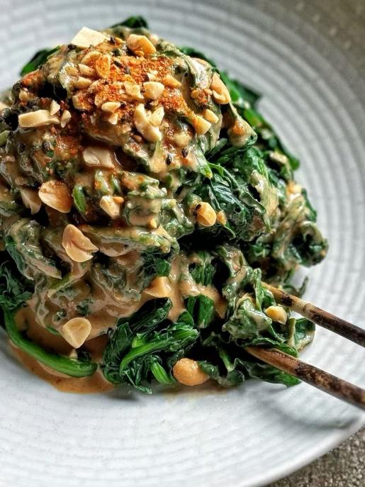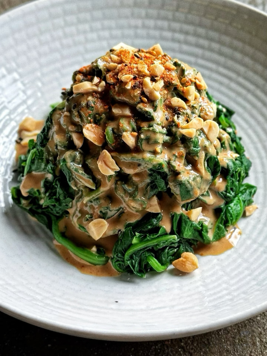 3. Assemble: Plate the spinach, drizzle generously with the peanut sauce, and sprinkle with crushed peanuts.