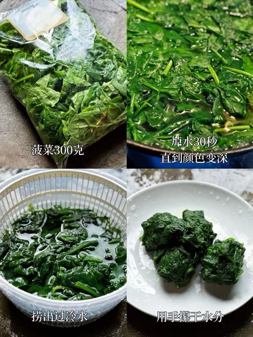 2. Prepare the spinach: Wash the spinach. Blanch in boiling water for about 30 seconds until it turns deep green. Remove and rinse several times in cold water until cooled. Squeeze out excess water by hand.