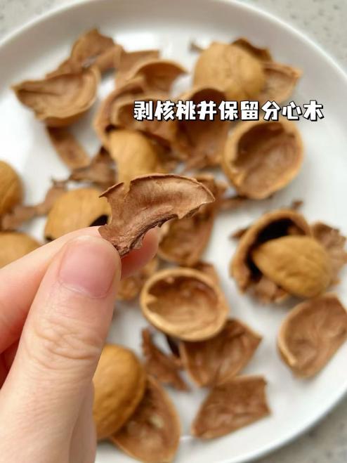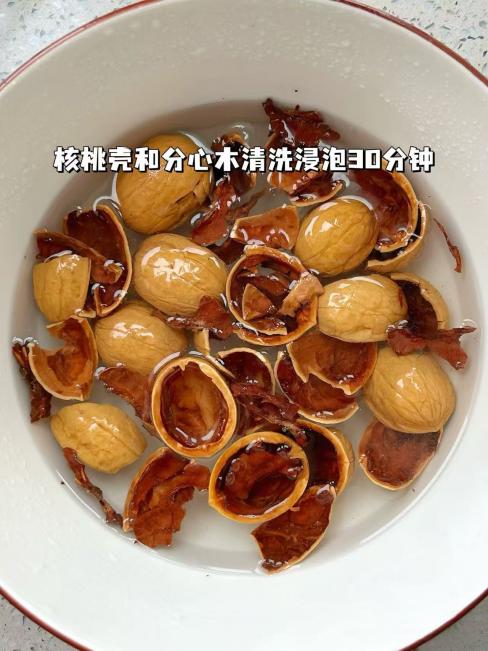 Wash walnut shells thoroughly, gently brushing crevices with a toothbrush. Break into small pieces ( Keep the diaphragm inside). Soak in cold water for 30 minutes to remove impurities.