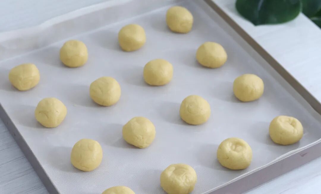 5.The large dough is divided into several small pieces, each weighing approximately 15 grams. After being rolled into balls, they are placed on the baking tray, with a certain distance maintained between each piece, as the dough will gradually expand and become round during the baking process.