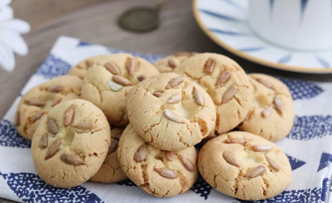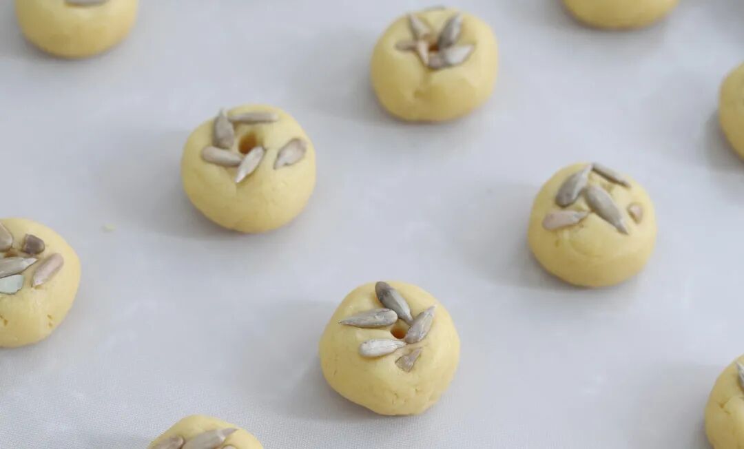 290 grams of low-gluten flour, 120 grams of lard, 40 grams of butter, 140 grams of sugar, 2 egg yolks, 2 grams of baking powder, 4 grams of baking soda, 1 gram of salt, 100 grams of sunflower seeds.