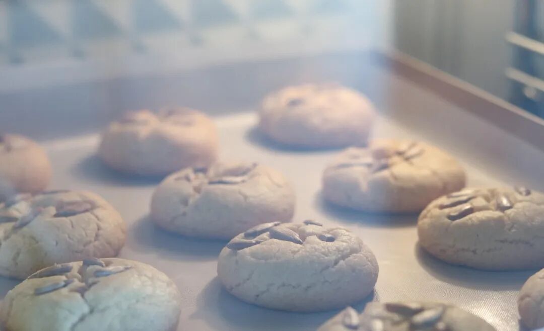 7.Place it in the preheated oven (180 degrees Celsius, both upper and lower heating), bake in the middle layer for 18-20 minutes. The surface of the sesame cookies should be slightly colored when done. After baking, remove it immediately from the oven and let it cool completely. Then, it needs to be sealed for storage to prevent moisture absorption and softening.