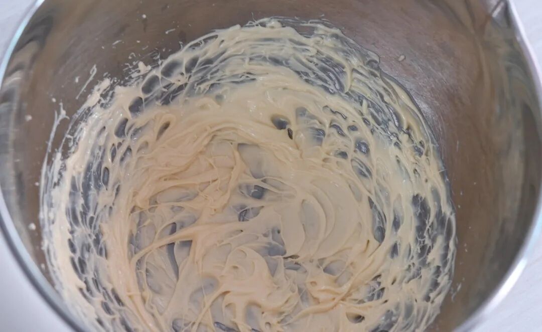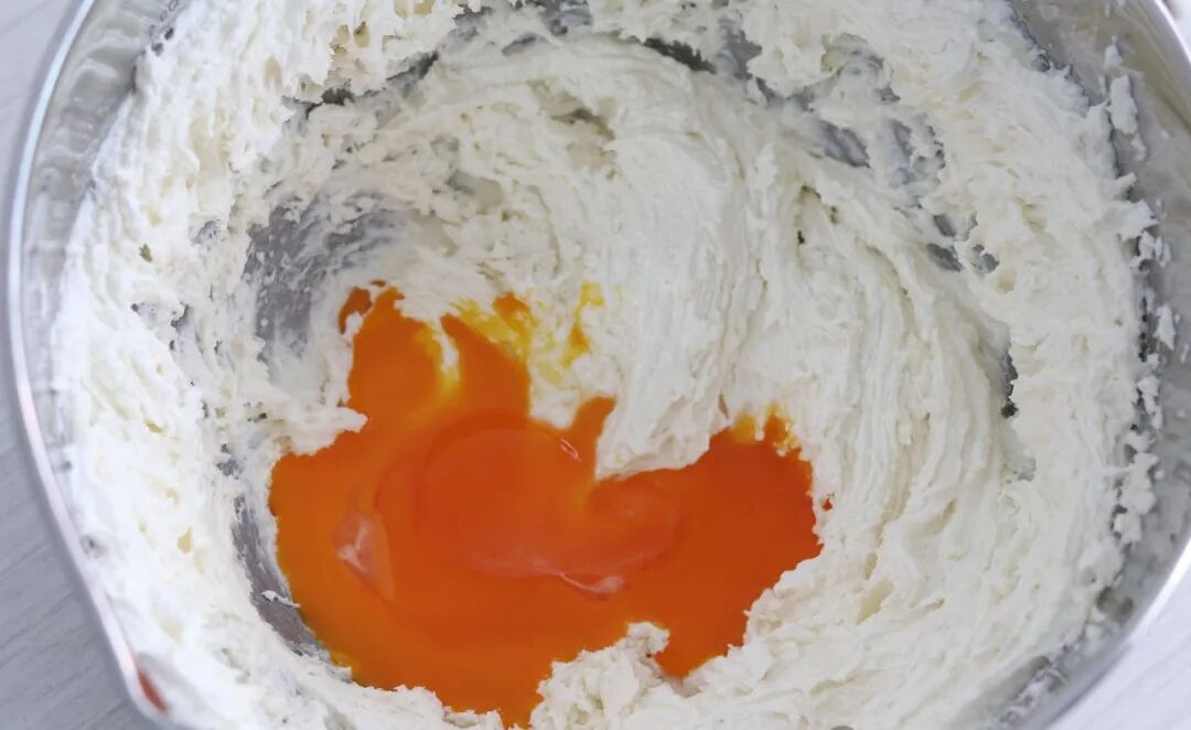 3. Add the egg yolks and continue to mix thoroughly at a low speed.