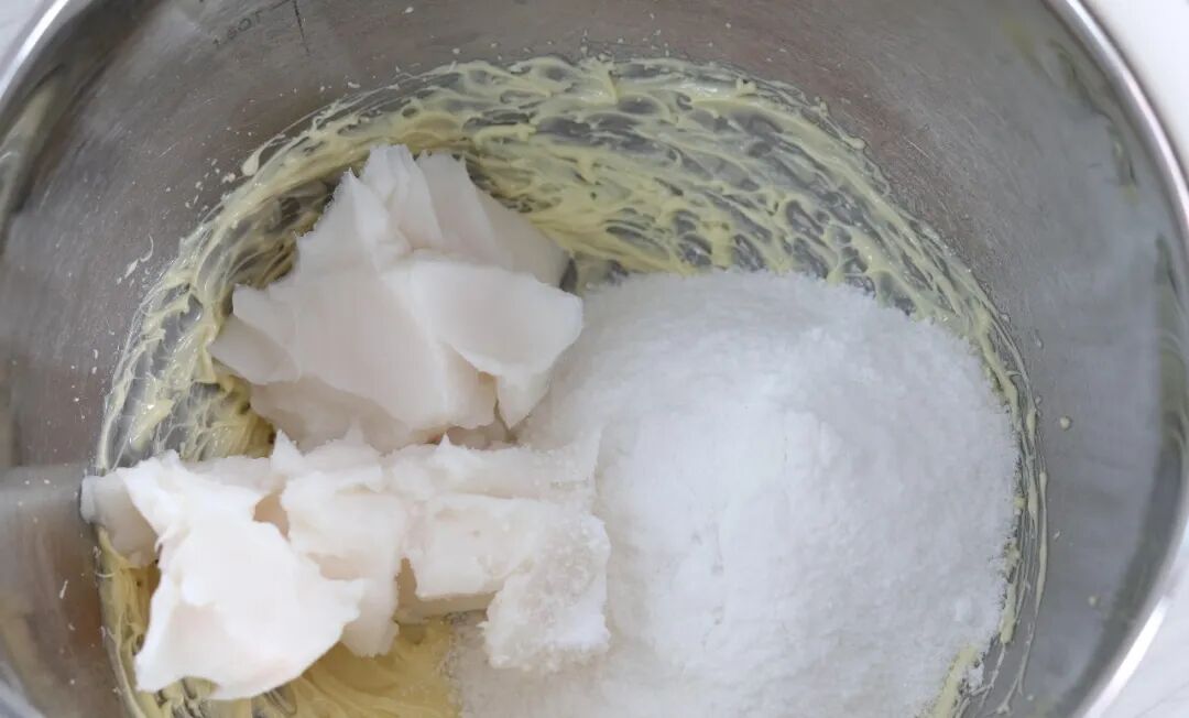 2. Add sugar and butter, and continue to beat with the electric mixer at low speed until well combined.