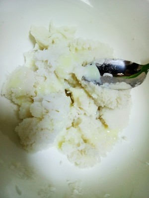 Step 5. Use a spoon to scrape the yam puree into a bowl, add 20 grams of condensed milk and stir evenly.