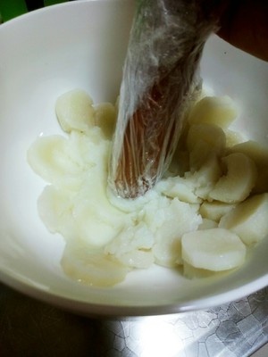 Step 2. Wrap the rolling pin with plastic wrap and mash the steamed yam into puree.