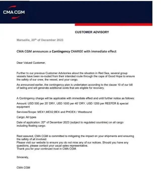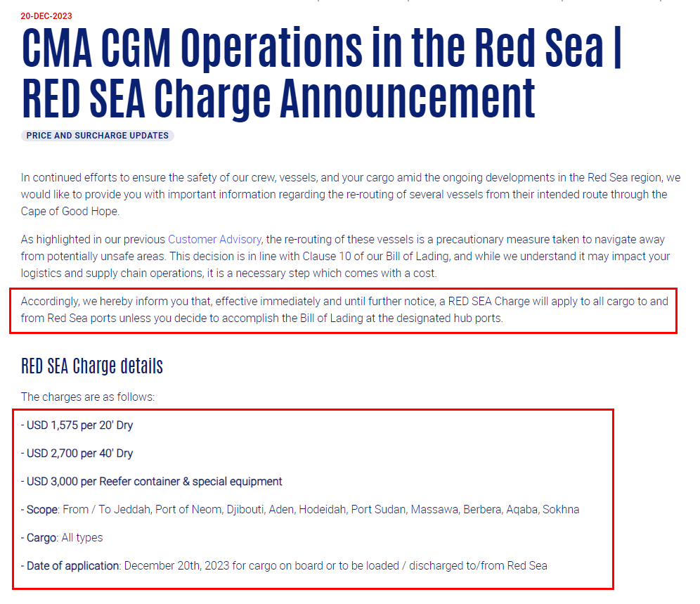 At the same time, CMA-CGM announced that the above Red Sea Charge will be effective from December 20, 2023 and will be valid for all cargoes loaded or to be loaded/unloaded at the port of embarkation.