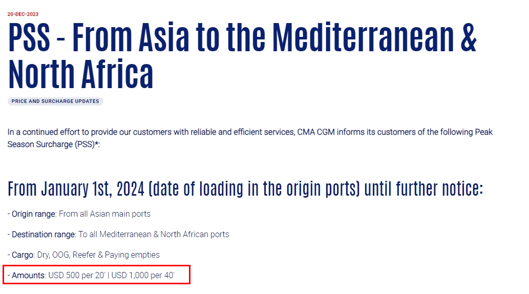 In addition, CMA-CGM 20 announced a Peak Season Surcharge (PSS) of US$500/TEU and US$1,000/FEU for cargoes on the Asia-Mediterranean and North Africa routes from January 1, 2024 (loading date at the port of origin).