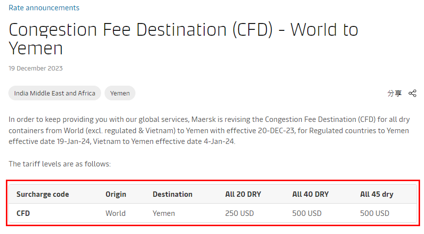 Maersk said the congestion surcharge (CFD) for all dry containers worldwide (excluding Vietnam and other regulated countries) to Yemen is $250/TEU, $500/FEU, effective from 20/12/23.