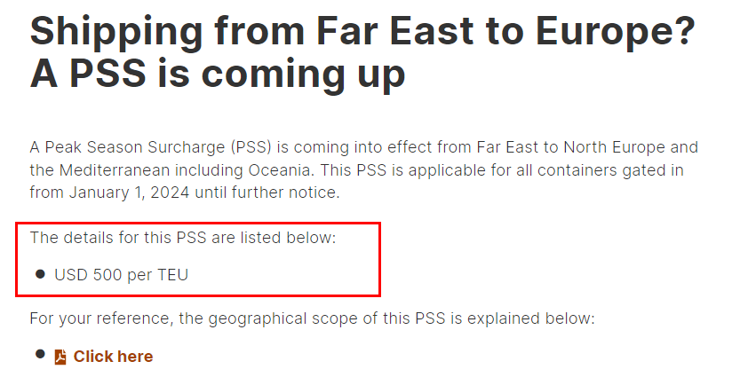 Hapag-Lloyd issued a notice on 20 January, announcing the imposition of a Peak Season Surcharge (PSS) of USD 500/TEU on routes from the Far East to Northern Europe and the Mediterranean, effective January 1, 2024, until further notice.