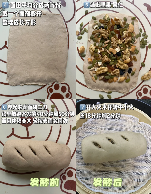 2.Take out the dough and knead it smooth and divide it equally into two equal parts, take one dough and organize it into a rectangle, spread the nuts on the dough, roll it up and make three cuts on the surface.